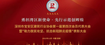 日前,深圳市宝安区建筑行业协会隆重召开第一届第四次会员代表大会暨“助力脱贫攻坚、抗击新冠肺炎疫情”表彰大会,此次大会主题为“勇担湾区新使命、先行示范创辉煌”。表彰大会上,深圳市科建建设集团由于在抗击疫情和脱贫攻坚行动上作出的成绩和贡献,被评定为“助力脱贫攻坚先进单位”“抗击新冠疫情特别贡献奖”单位、...